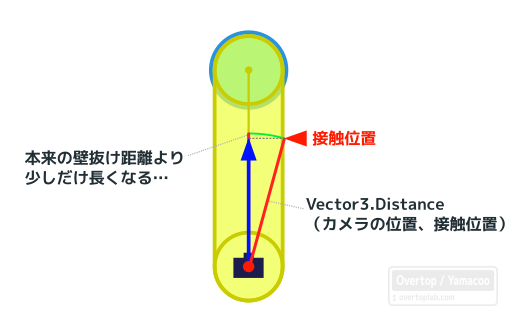 もし正確に青矢印を算出するのなら、Mathf.Sqrt(Vector3.SqrMagnitude(カメラ位置 , 接触位置) – SphereCastの半径2 )になるかと思います。