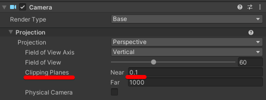 シェーダーの方でカメラが近い場合にオブジェクトを半透明にしたりもできるので、Clipping PlanesのNearは0にした上で特定のオブジェクトのシェーダーだけ半透明にさせる方法もあるのかなと思います。