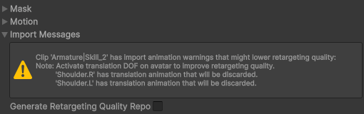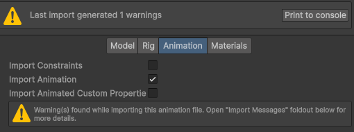 Warnings found while importing this animation file. Open “Import Messages” foldout below for more details.