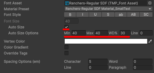 TextMeshProの設定を見ていったところ、文字を拡縮させる設定がありました。