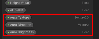 上記のテクスチャに加えて、エフェクトの方向・スピード用のVector2とエフェクトの強度(0~1のFloat)を用意します。