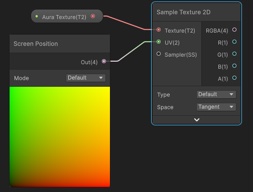 Sample Texture 2Dの出力に強度用のFloatの値(Aura Brightness)を乗算してからサブグラフからのEmissionに加算し、Fragmentにつなぎます。
