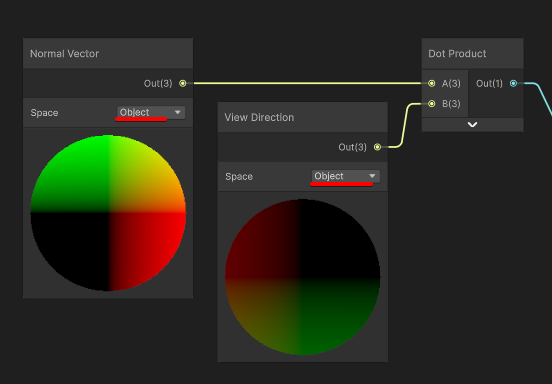 まず、Normal VectorとView Directionを配置します。両方ともSpaceをObjectにしてからDot Productノードにつなぎます。