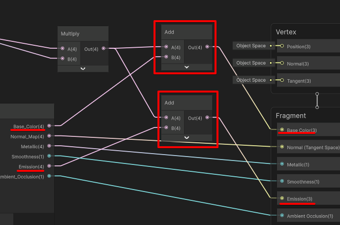 ここは好みで、Base Colorだけに加算・Emissionだけに加算・加算ではなく乗算…などやりたい表現に合わせて変えると良いかと思います。